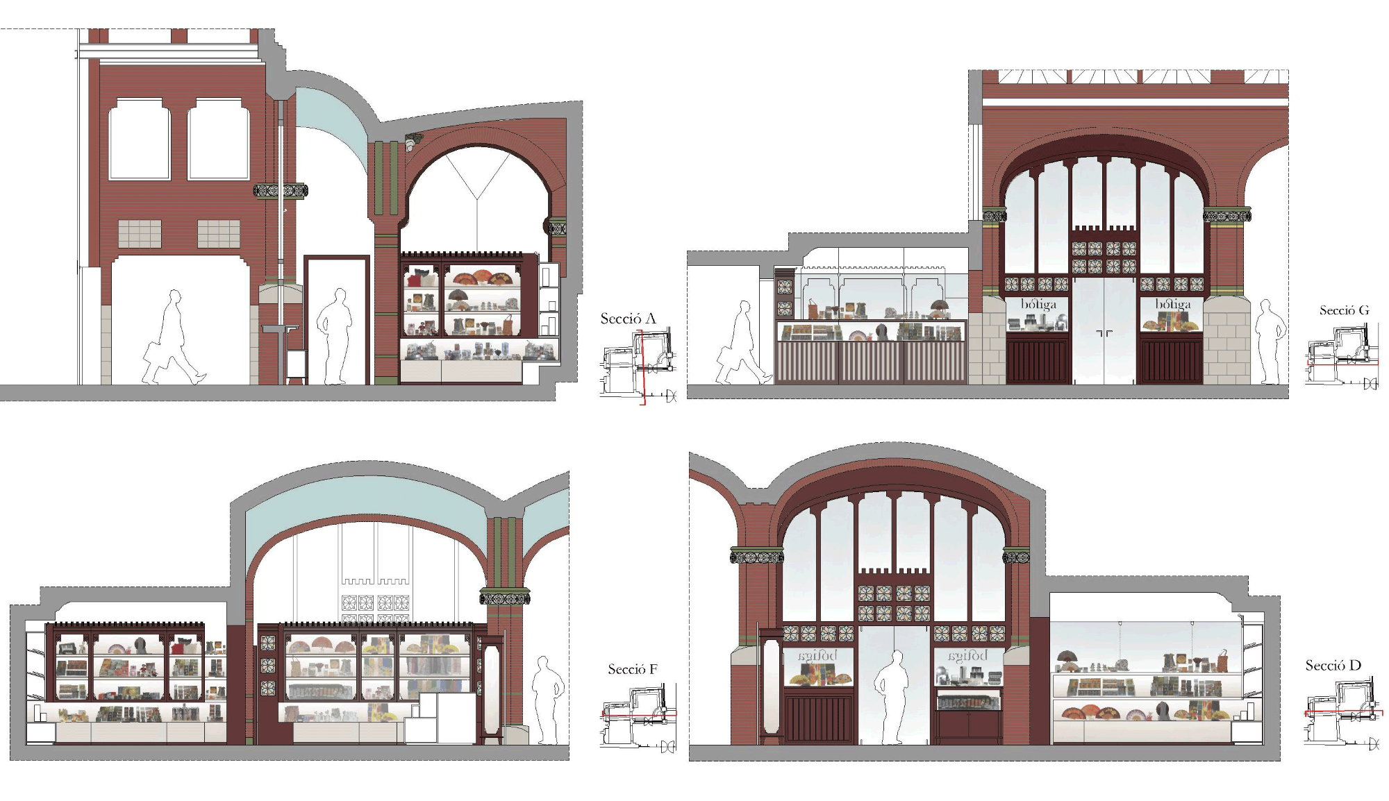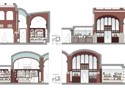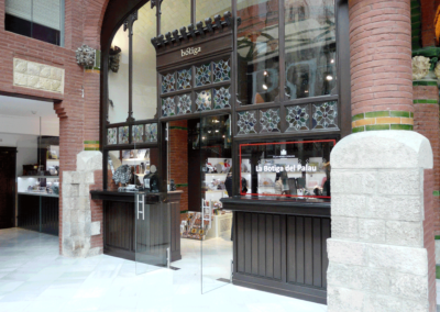 In this Barcelona landmark (World Heritage Site by Unesco since 1997) the furniture design stays true to the modernist character of the building, featuring detailed wood niches with lacquered finish interior to display products.