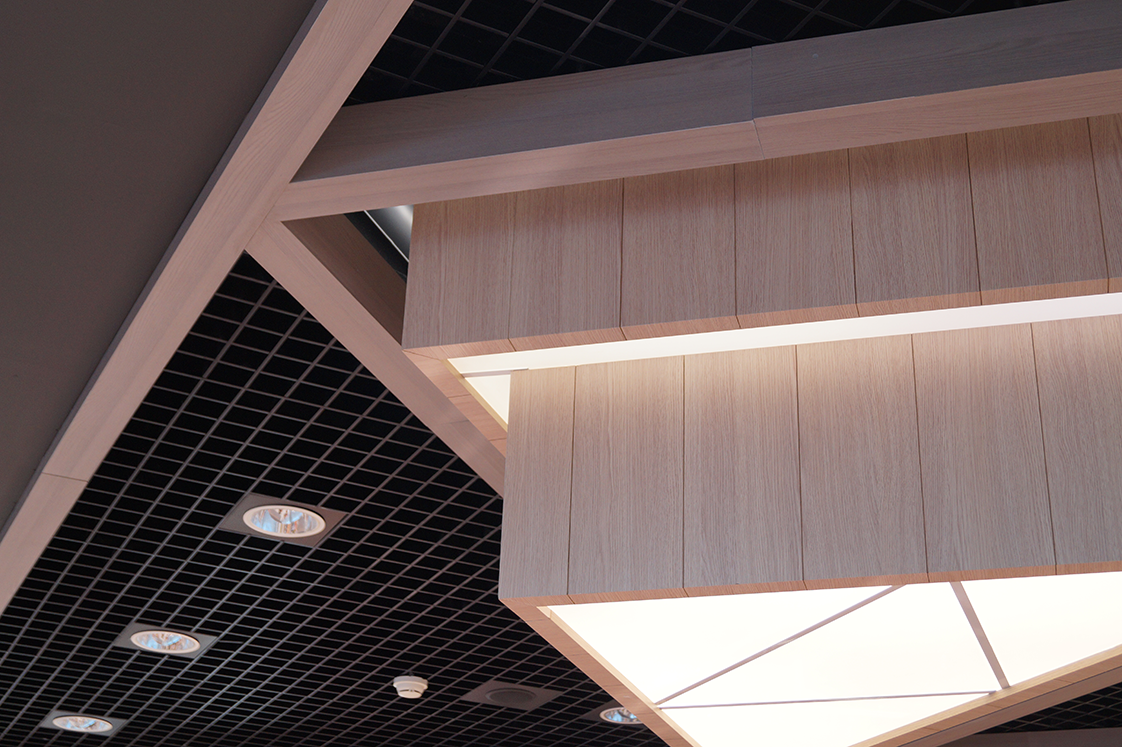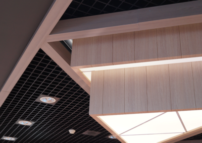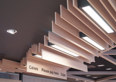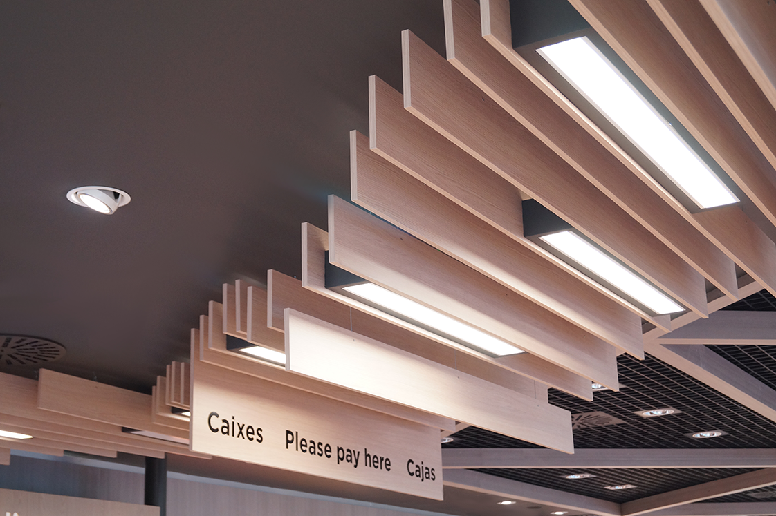 En esta tienda la madera es protagonista. Se usa tanto en la geometría triangular y en las traviesas a diferente altura del techo como en el suelo marcando el camino a las cajas. En el centro del local y a modo de hito se encuentra una gran lámpara triangular a varios niveles también en madera.