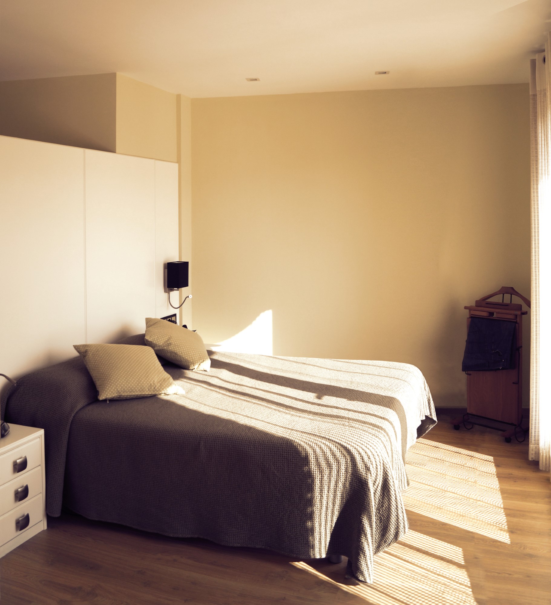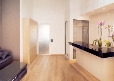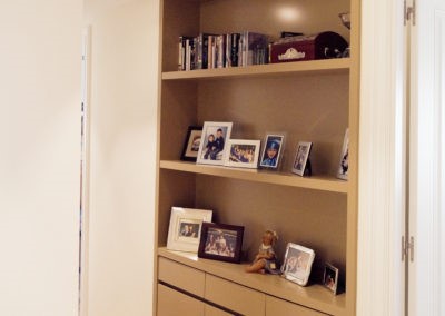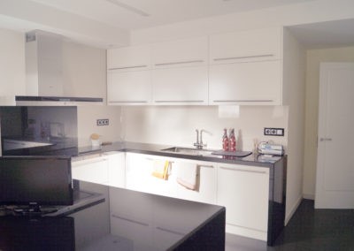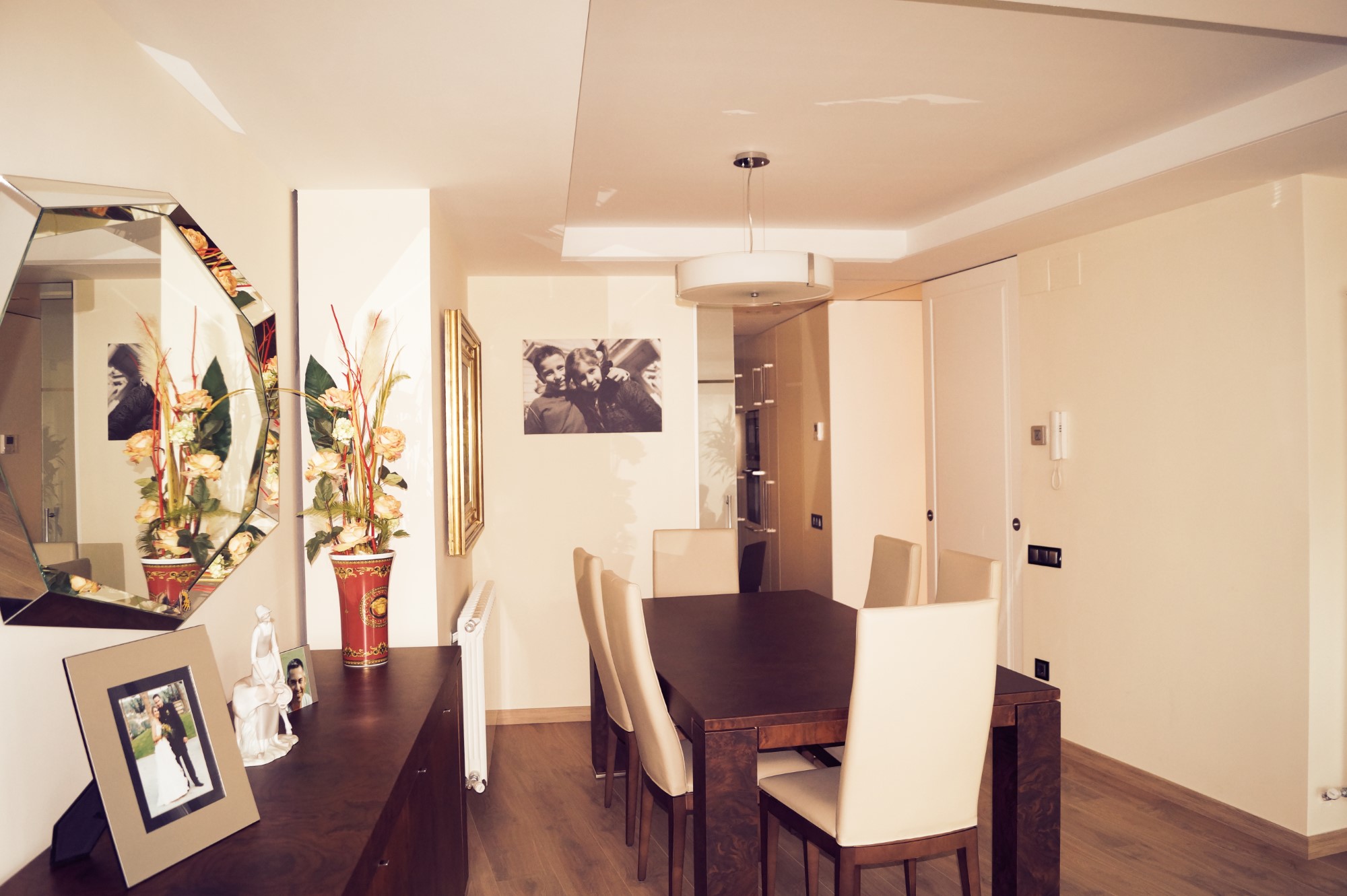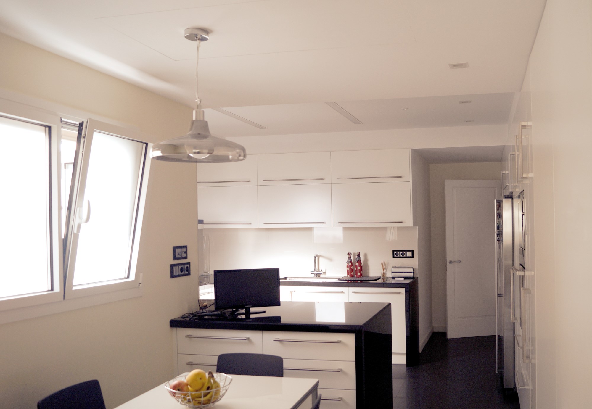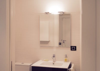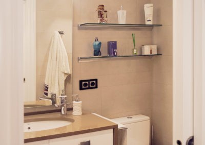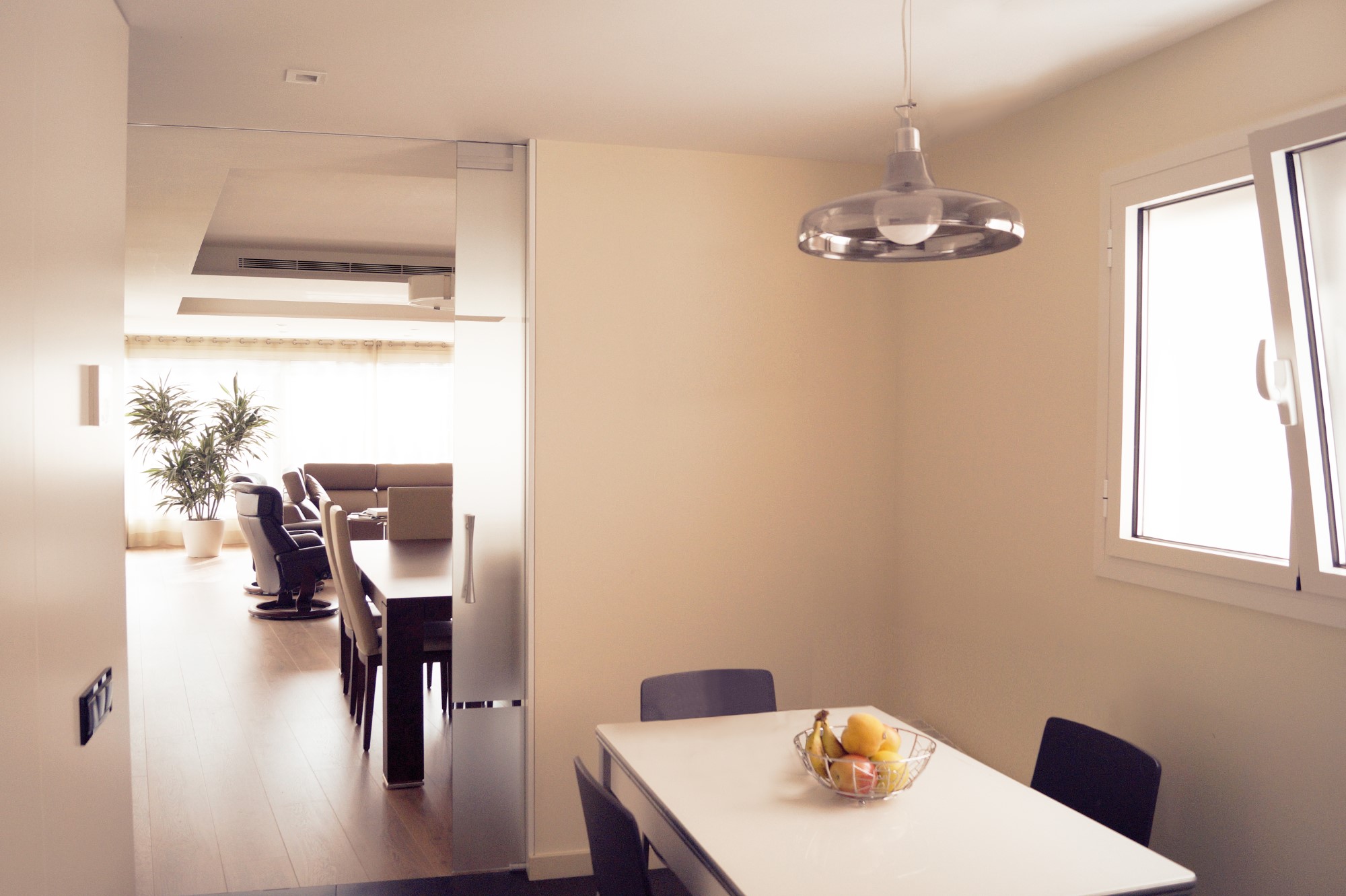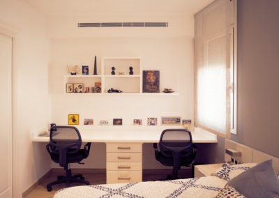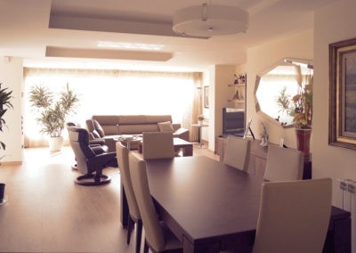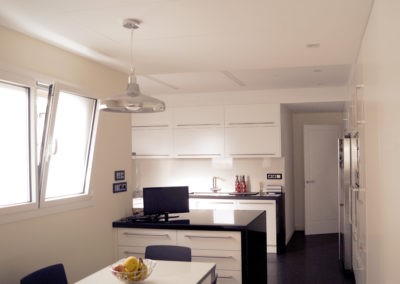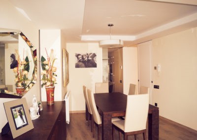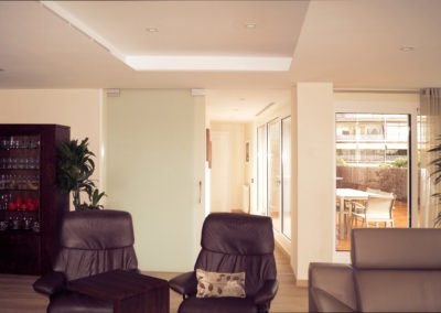 Mejoramos la transición entre sala, comedor, office y cocina, proporcionando comunicación y visuales fluidas. Con la eliminación de estancias obsoletas, creamos dos habitaciones en suite con vestidor incorporado y una sala de ocio con barra bar integrada.