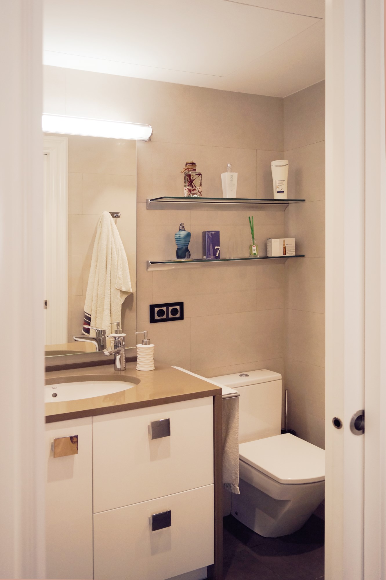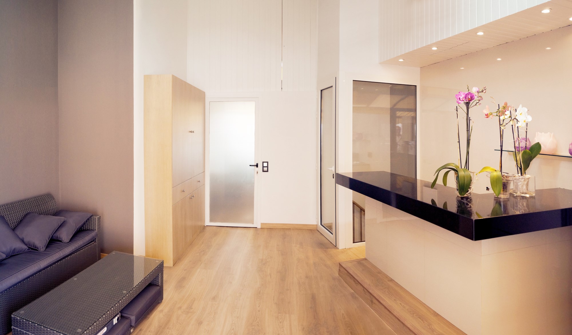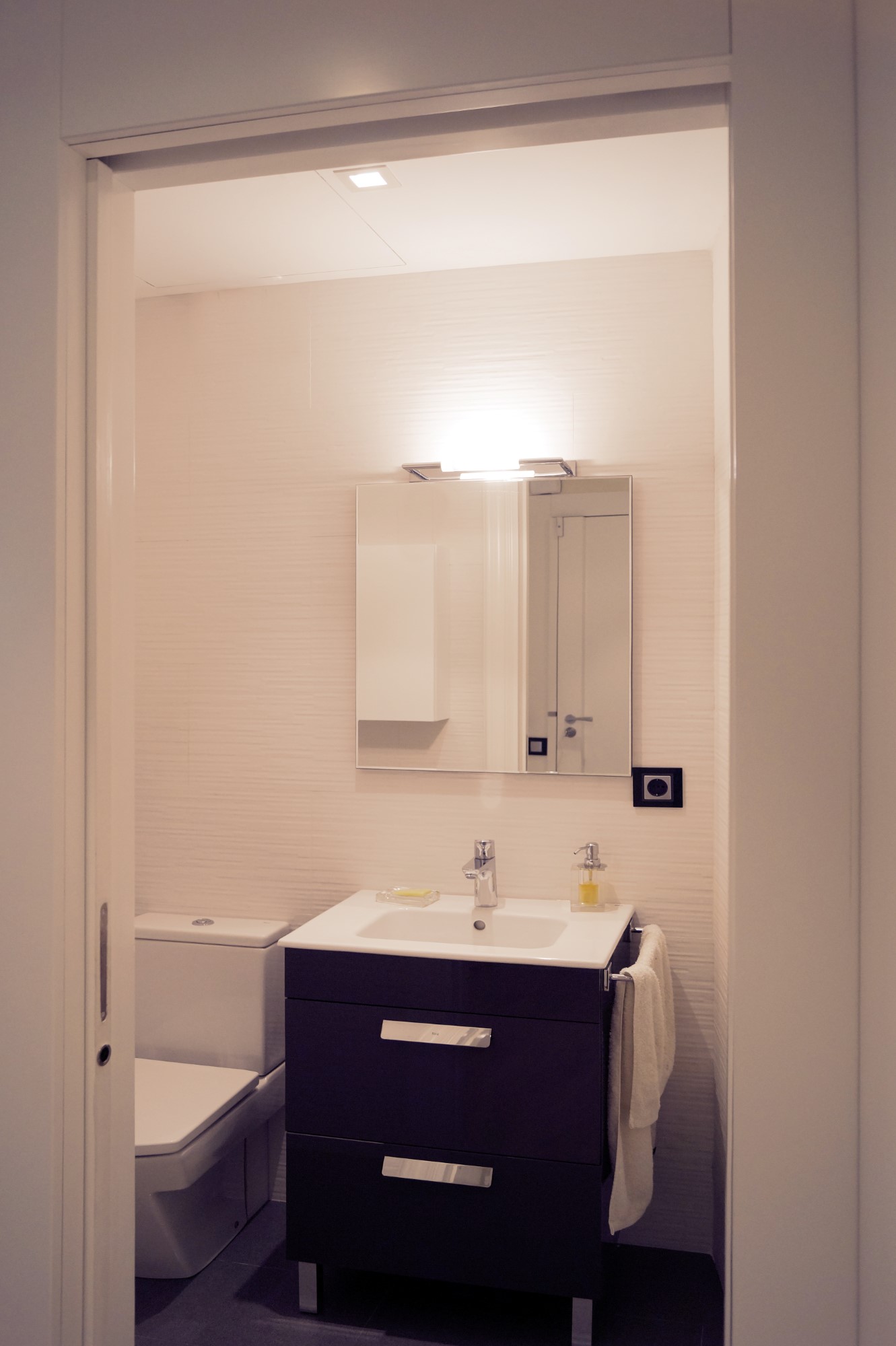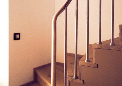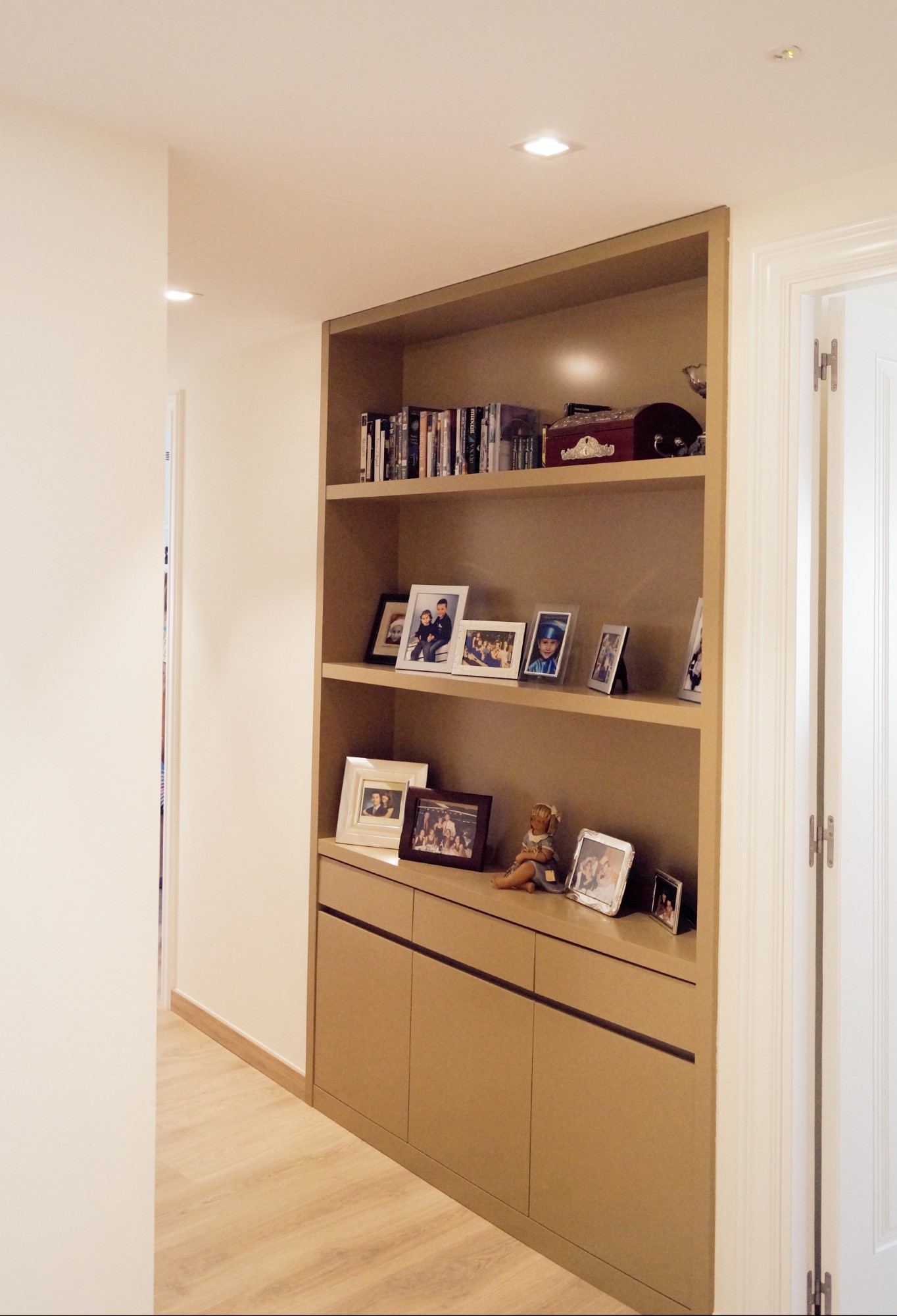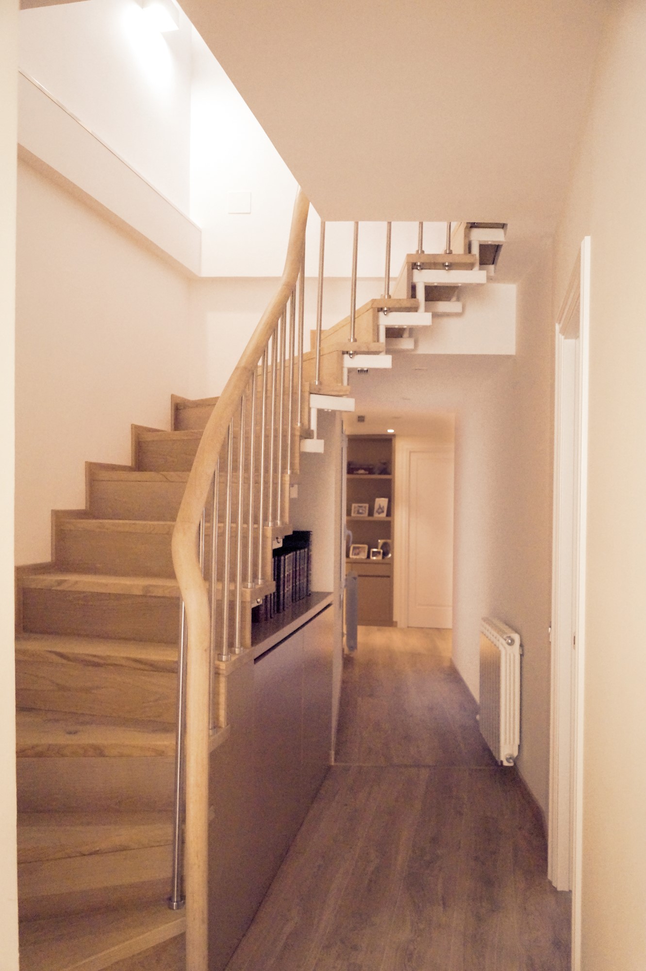 Mejoramos la transición entre sala, comedor, office y cocina, proporcionando comunicación y visuales fluidas. Con la eliminación de estancias obsoletas, creamos dos habitaciones en suite con vestidor incorporado y una sala de ocio con barra bar integrada.